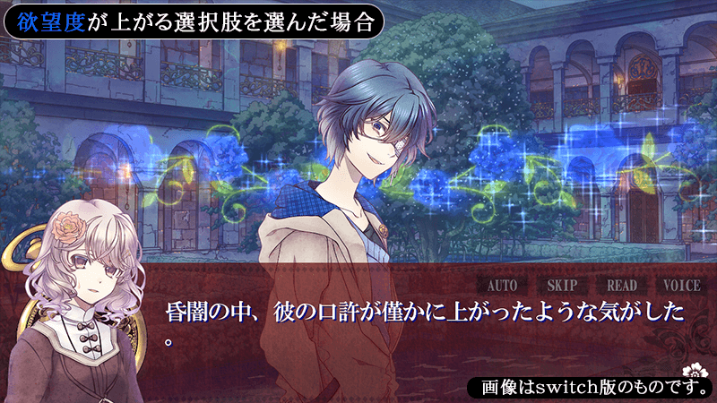 【好感度】が上がる選択肢を選んだ場合“赤い薔薇”が、【欲望度】が上がる選択肢を選んだ場合“青い薔薇”が、画面上に咲き誇ります。