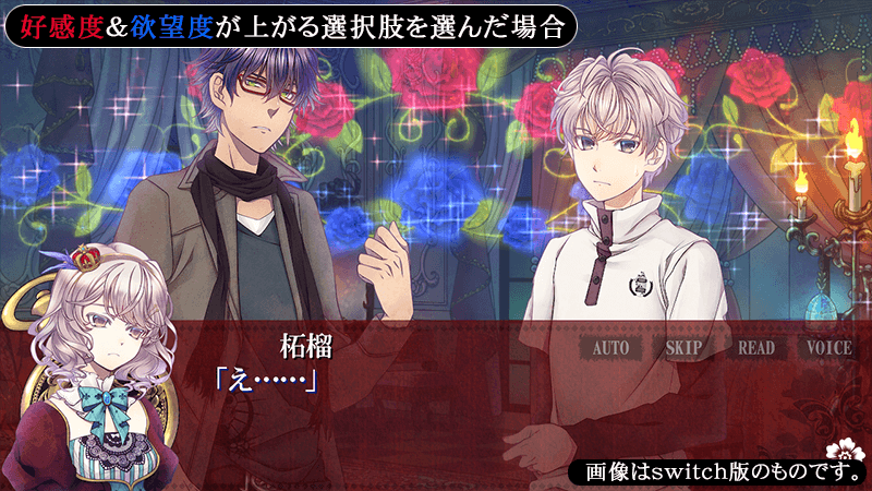 【好感度】と【欲望度】はゲーム進行中の選択肢により上下が可能です。【好感度】が上がる選択肢を選んだ場合“赤い薔薇”が、【欲望度】が上がる選択肢を選んだ場合“青い薔薇”が、画面上に咲き誇ります。