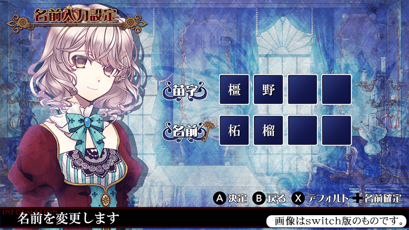 名前は『苗字』『名前』ともに変更可能です。デフォルト名【橿野柘榴】のままであれば、ゲーム中での称呼に音声が付きます。